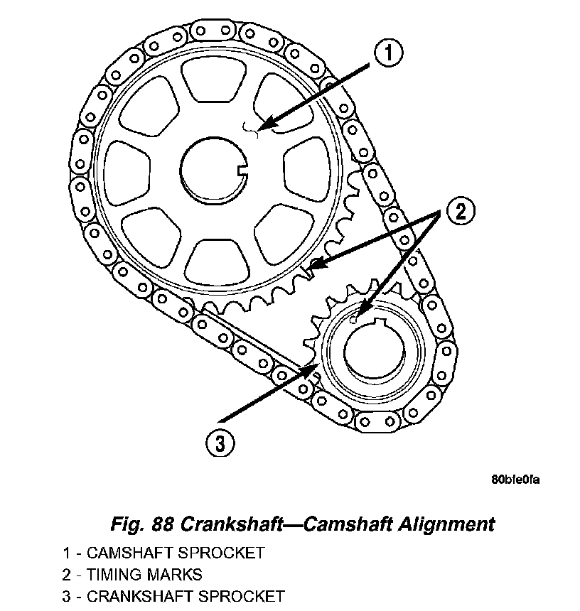 Assemble the timing chain, crankshaft sprocket and camshaft sprocket with the timing marks aligned (Fig. 88).