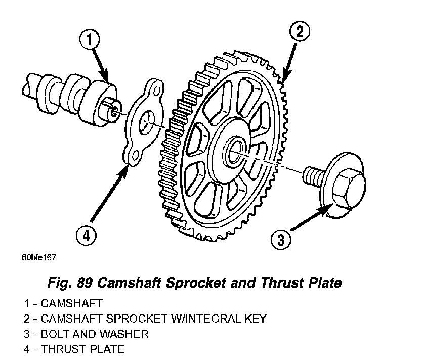 2. Install the camshaft sprocket bolt and washer (Fig. 89). Tighten the bolt to 68 Nm (50 ft. lbs.) torque.