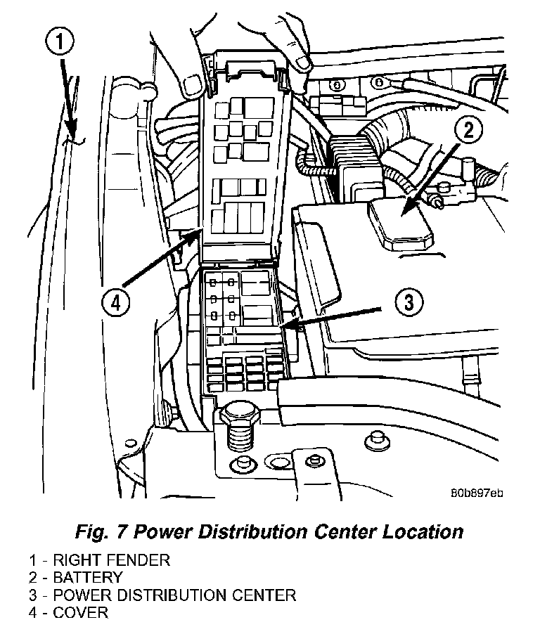 All of the electrical current distributed throughout this vehicle is directed through the standard equipment Power Distribution Center (PDC) (Fig. 7). The molded plastic PDC housing is located in the right front corner of the engine compartment, between the battery and the right front inner fender shield. The PDC houses up to fifteen maxi-type cartridge fuses, which replace all in-line fusible links. The PDC also houses up to thirteen blade-type mini fuses, and up to ten International Standards Organization (ISO) relays (two standard-type and eight micro-type).