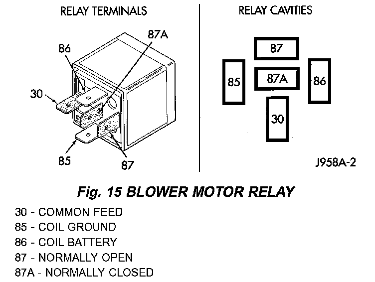 WARNING: ON VEHICLES EQUIPPED WITH AIRBAGS, DISABLE THE AIRBAG SYSTEM BEFORE ATTEMPTING ANY STEERING WHEEL, STEERING COLUMN, OR INSTRUMENT PANEL COMPONENT DIAGNOSIS OR SERVICE. DISCONNECT AND ISOLATE THE BATTERY NEGATIVE (GROUND) CABLE, THEN WAIT TWO MINUTES FOR THE AIRBAG SYSTEM CAPACITOR TO DISCHARGE BEFORE PERFORMING FURTHER DIAGNOSIS OR SERVICE. THIS IS THE ONLY SURE WAY TO DISABLE THE AIRBAG SYSTEM. FAILURE TO TAKE THE PROPER PRECAUTIONS COULD RESULT IN AN ACCIDENTAL AIRBAG DEPLOYMENT AND POSSIBLE PERSONAL INJURY.Fig.15 Blower Motor Relay: