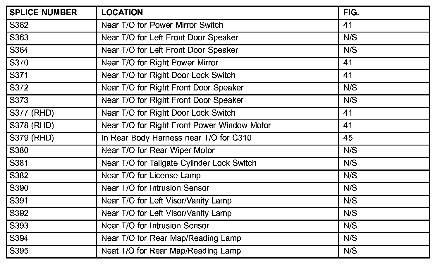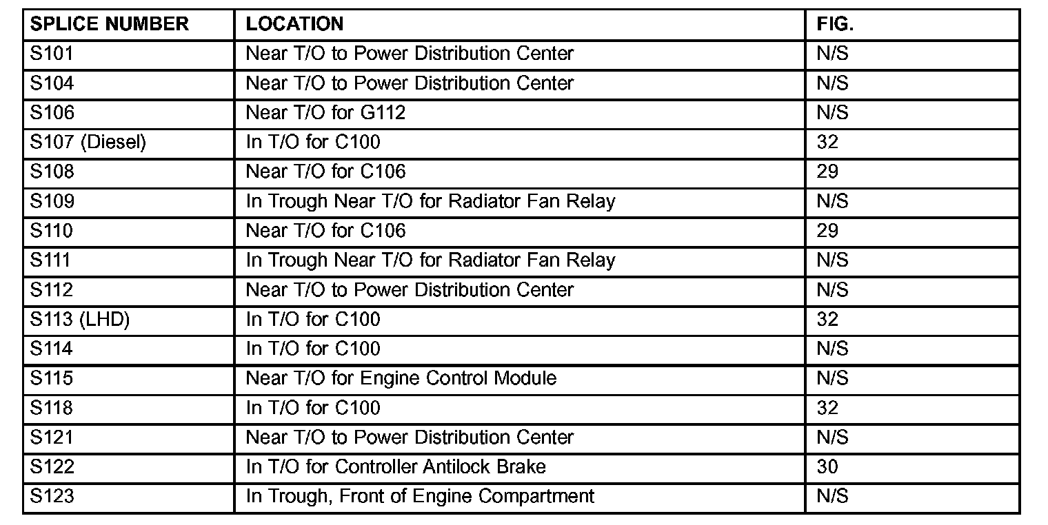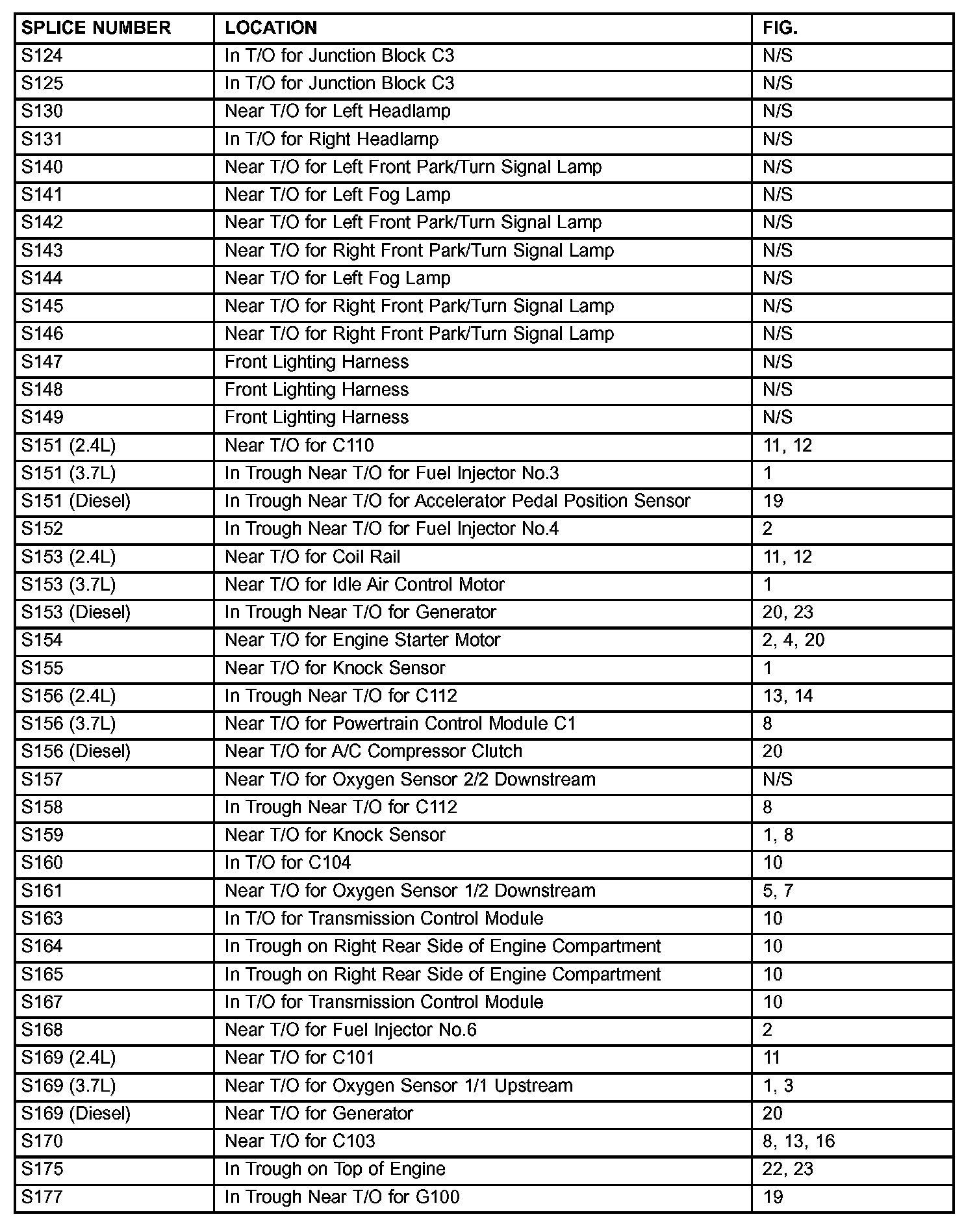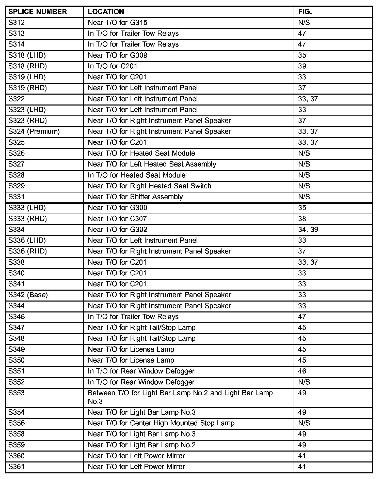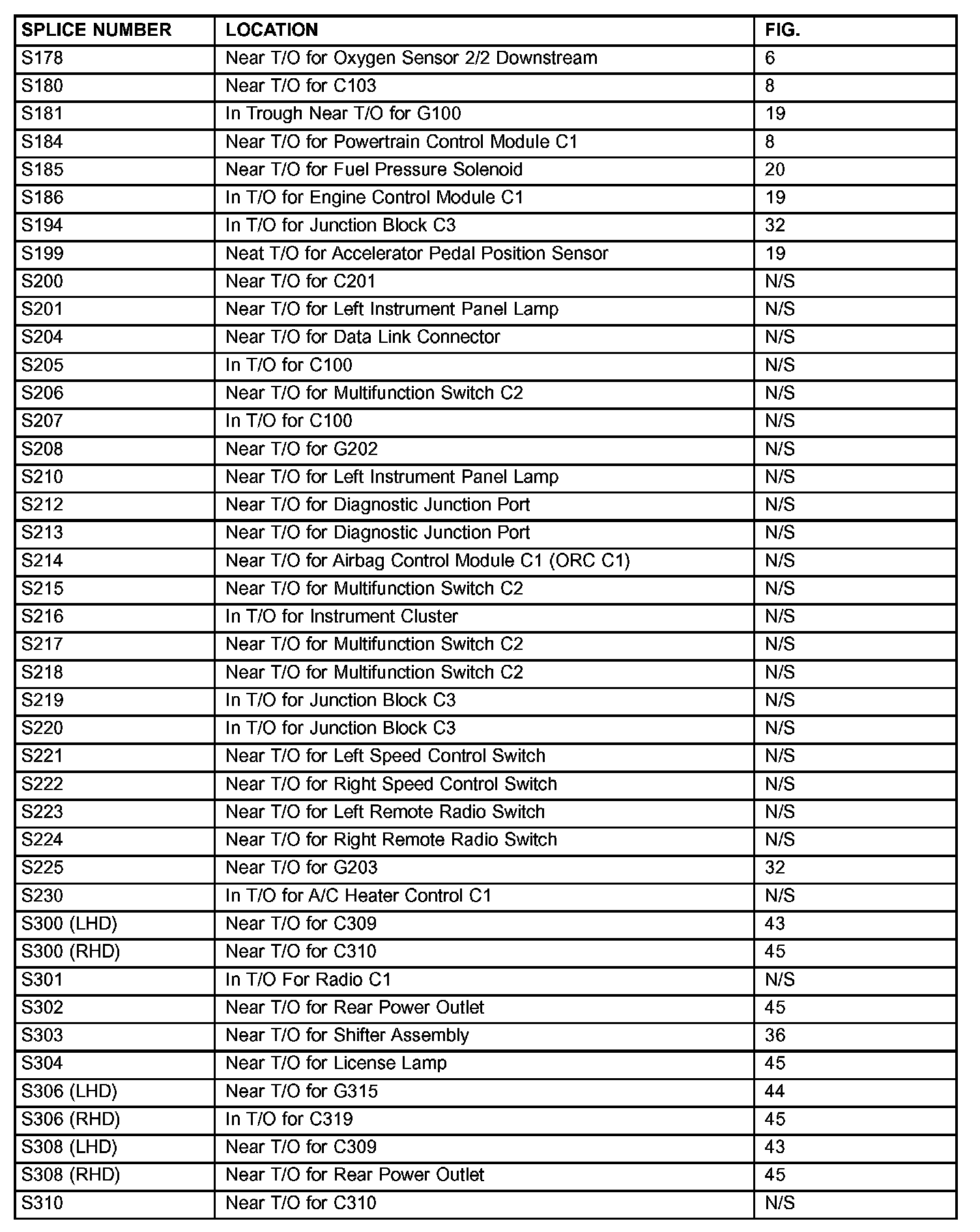 The abbreviation T/O (Take Out) is used in the location column to indicate a point in which the wiring harness branches out to a component.