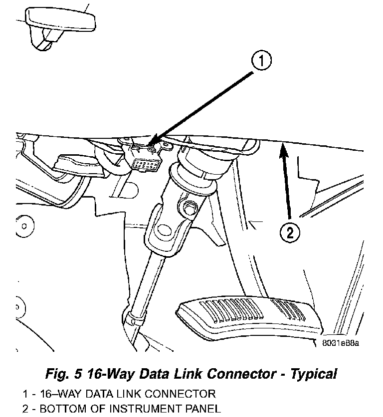 2. Be certain that the DRBIII scan tool contains the latest version of the proper DRBIII software. Connect the DRBIII to the 16-way Data Link Connector (DLC). The DLC is located on the driver side lower edge of the instrument panel, outboard of the steering column.