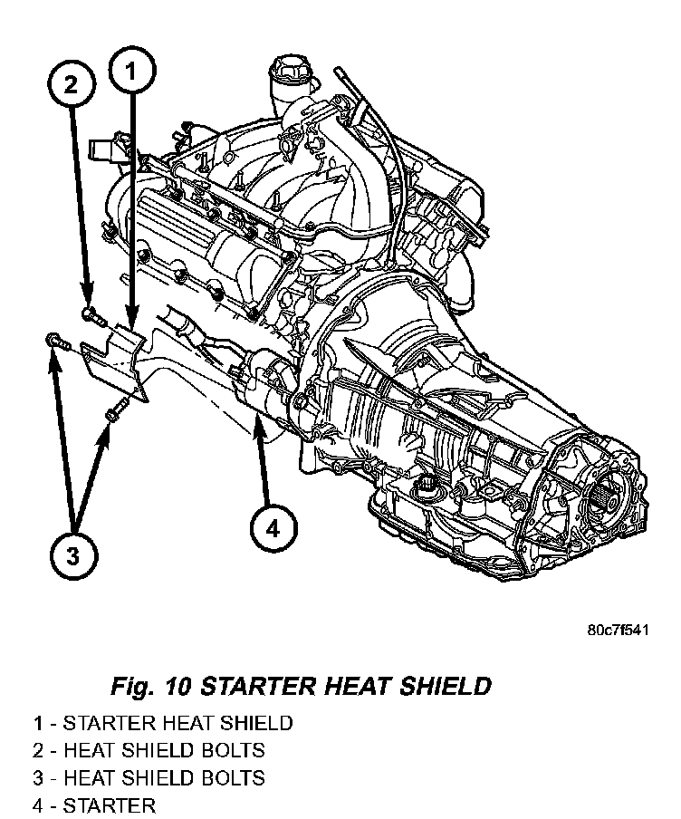 5. Remove 2 starter heat shield bolts at side of starter (Fig. 10).