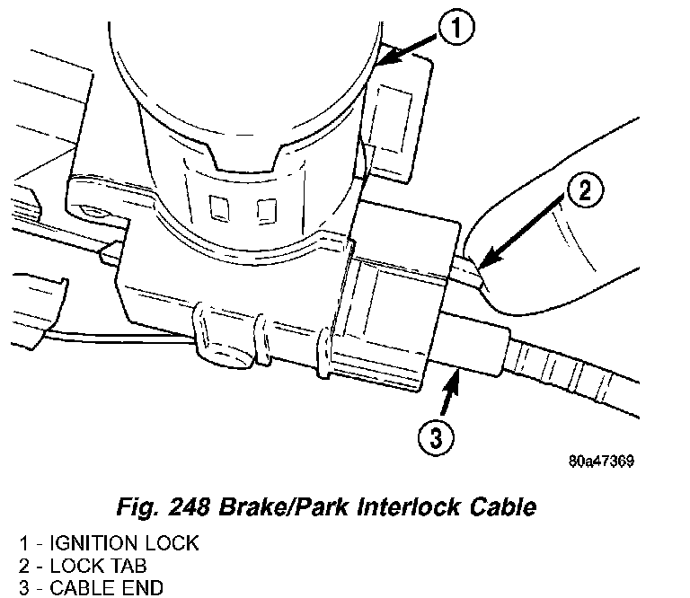 5. Disconnect the park-interlock cable from the shift lever assembly and remove the cable from the shifter assembly bracket (Fig. 247).