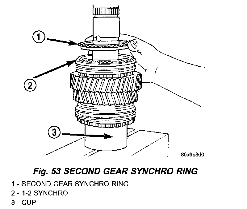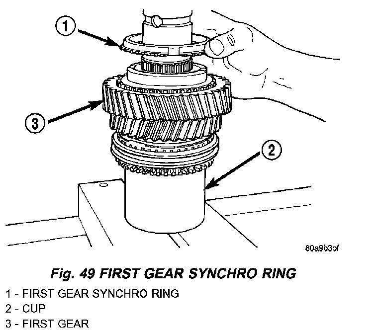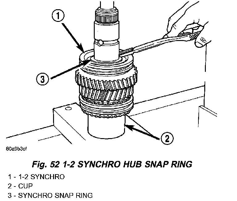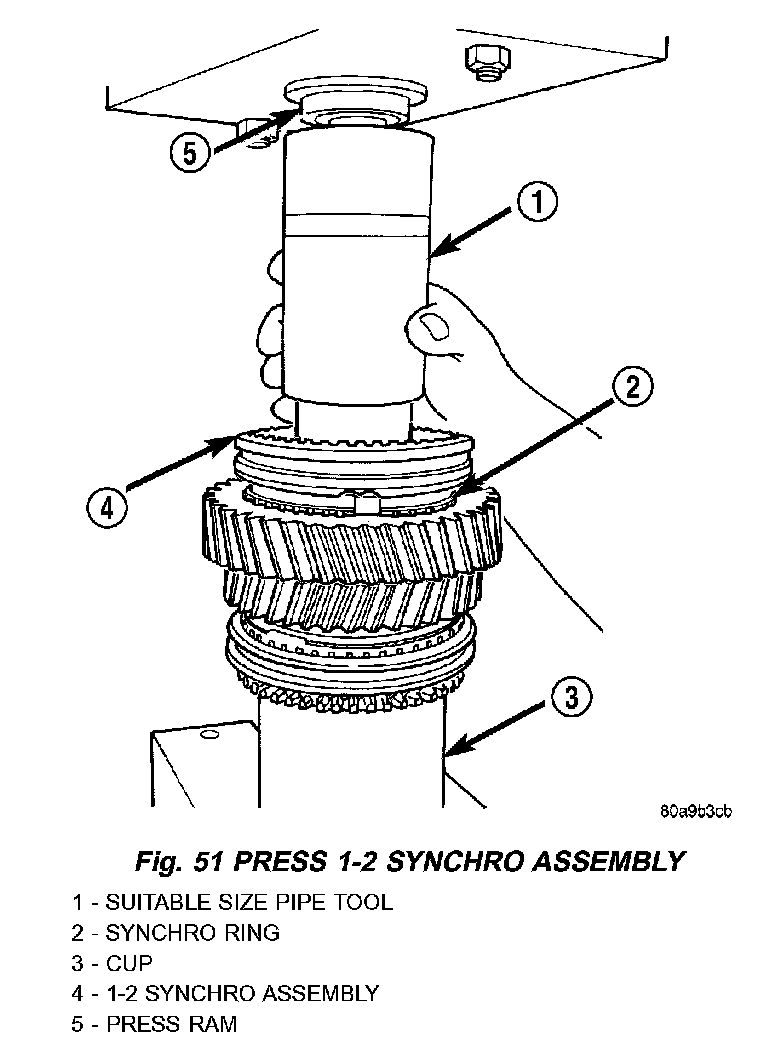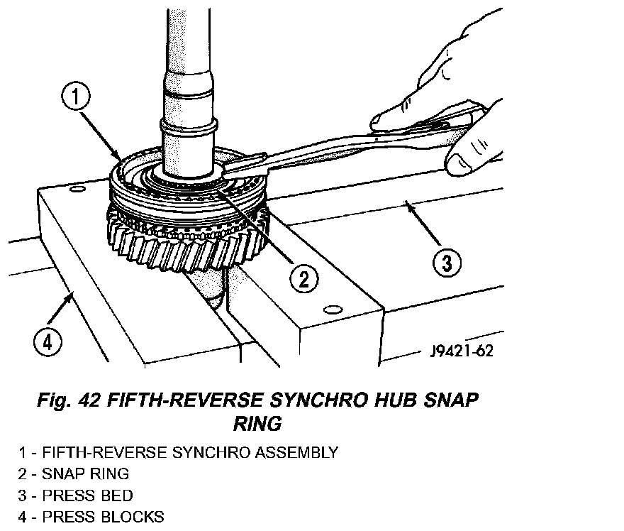 NOTE: The synchro hub is a press fit design. There may be instances where the press is not necessary. As long as there is a snug fit between the hub and the shaft, the hub does not need to be replaced.