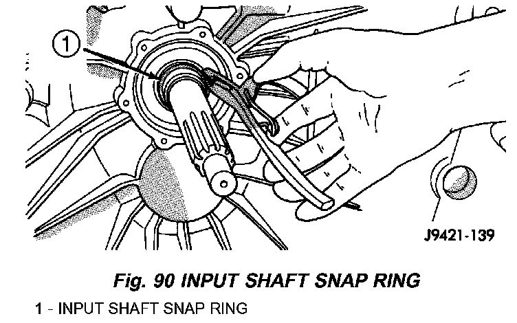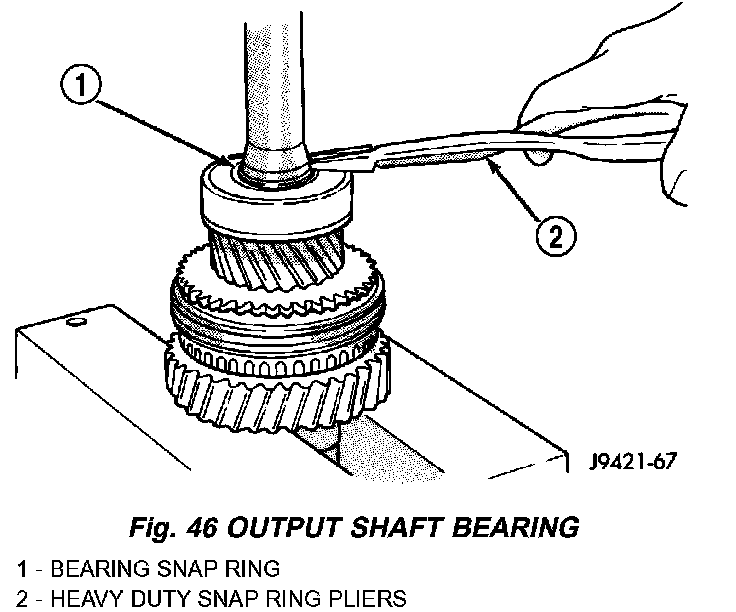 10. Install output shaft bearing snap ring, spread snap ring only enough to install it. Verify snap ring is seated in shaft groove.
