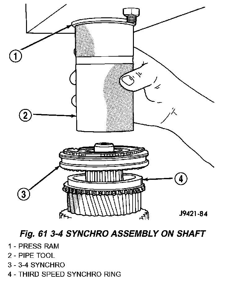 29. Press 3-4 synchro assembly onto output shaft with shop press and suitable size pipe tool. Press tool must be as close to the hub center as possible but not contacting the shaft splines.