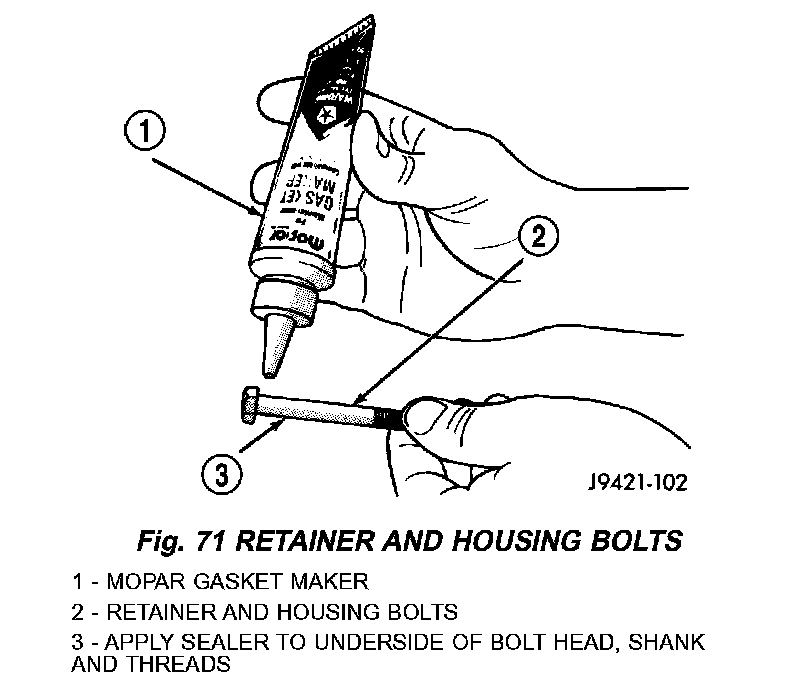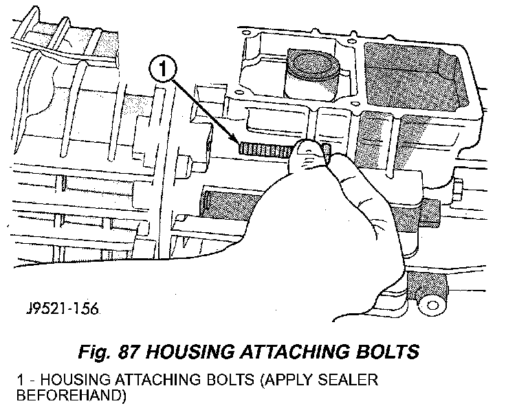 7. Apply Mopar Gasket Maker or equivalent to housing attaching bolts. Apply sealer material sealer to underside of bolt heads and to bolt shanks and threads.