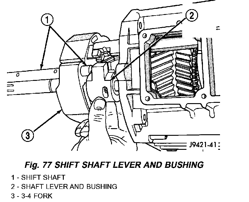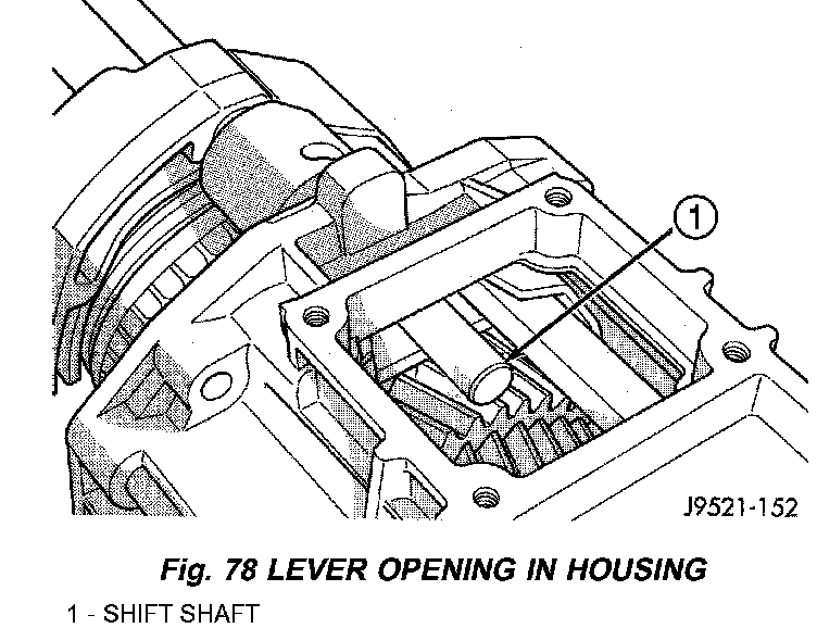6. Slide shift shaft through 1-2 and fifth-reverse fork and into shift lever opening in rear housing.