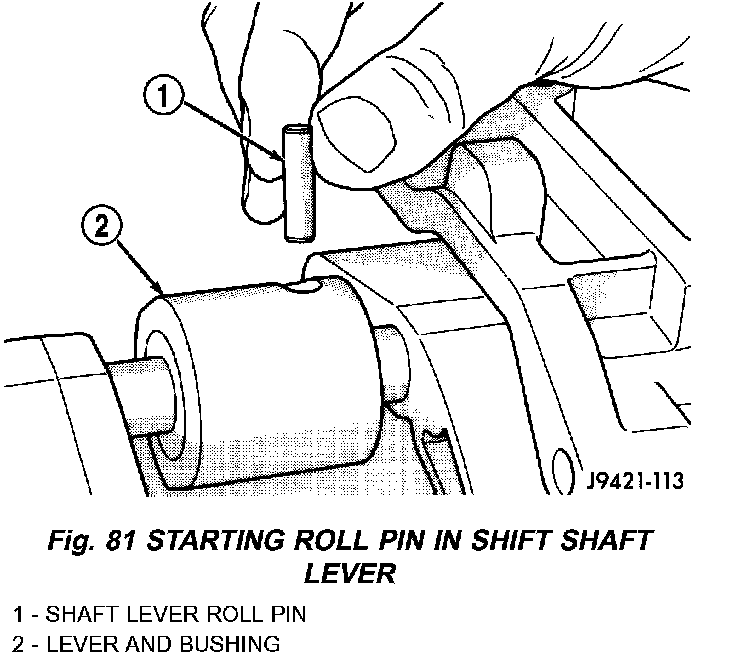 10. Align roll pin holes in shift shaft, lever and bushing, then start roll pin into shaft lever by hand.