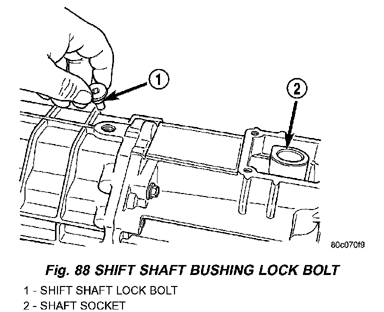 9. Install shift shaft bushing lock bolt. Apply Mopar Gasket Maker or equivalent to bolt threads, shank and underside of bolt head before installation.