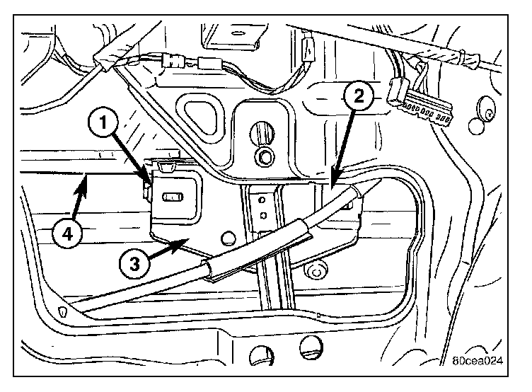 3. Raise the glass (4) to the position shown and using a long flat blade or hook type tool, disengage clips (1) attaching glass retainer to regulator lift plate (3).