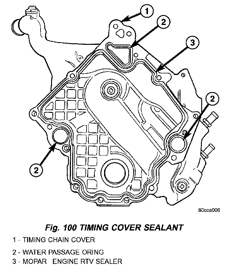 3. Apply Mopar Engine RTV sealer to front cover (Fig. 100).