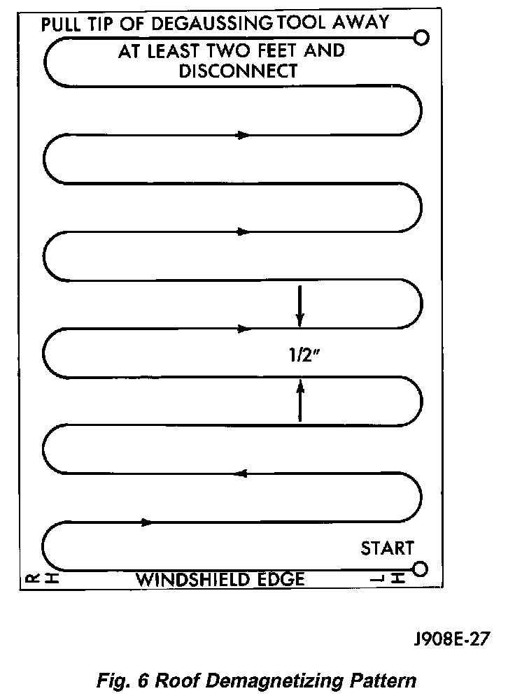 8. Slowly approach the center line of the roof panel at the windshield header, with the degaussing tool connected.