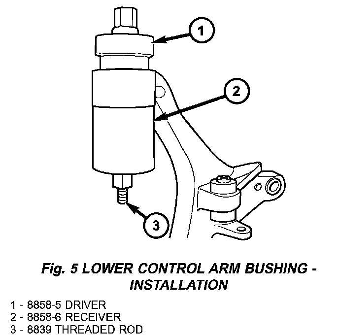 1. Install the new lower control arm bushings into the lower control arm using tools 8858-5 (driver), 8858-6 (receiver) and the bearing with the threaded rod 8839 making sure to properly orient the bushing in the control.