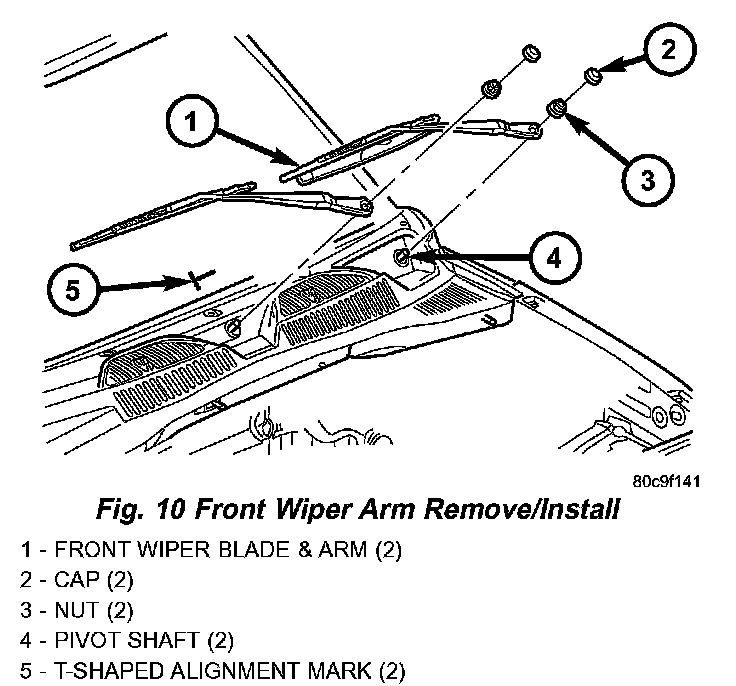 REMOVAL1. Lift the front wiper arm to its over-center position to hold the wiper blade off of the glass and relieve the spring tension on the wiper arm to wiper pivot shaft connection.