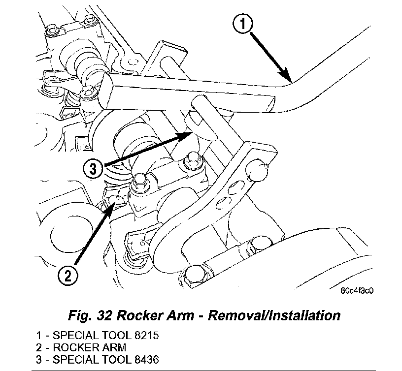 5. Using Special Tools 8215 and 8436 slowly depress valve assembly until rocker arm can be removed (Fig. 32).