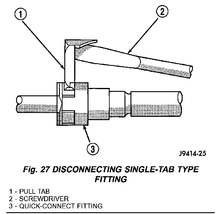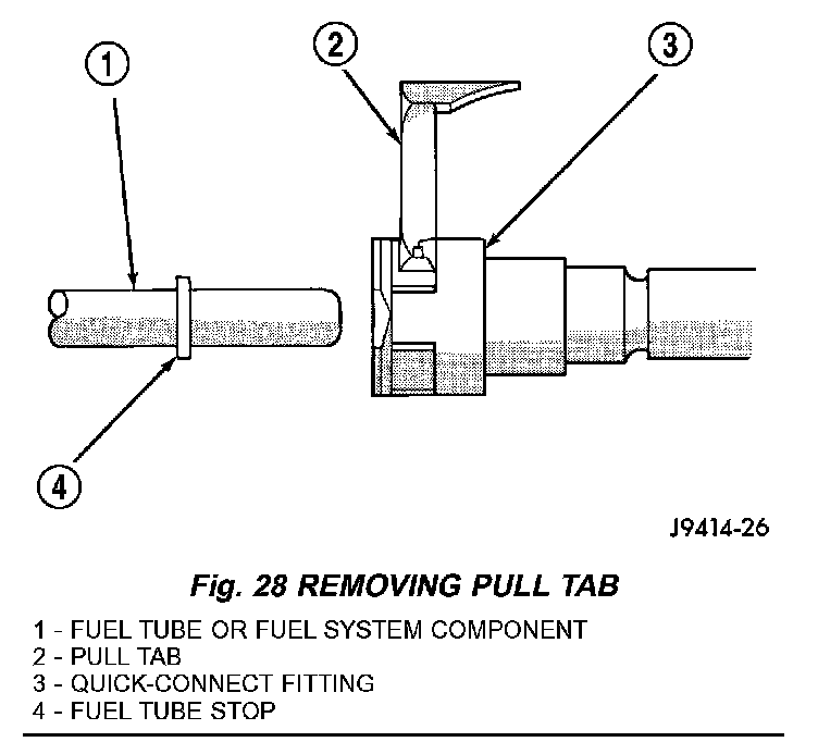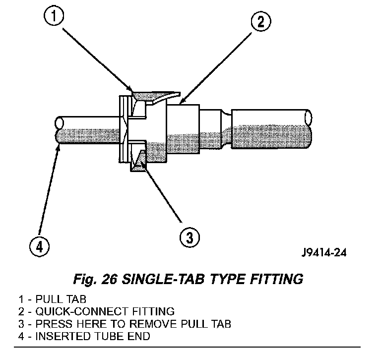 6. Single-Tab Type Fitting: This type of fitting is equipped with a single pull tab (Fig. 26). The tab is removable. After tab is removed, quick-connect fitting can be separated from fuel system component. Special tools are not required for disconnection.