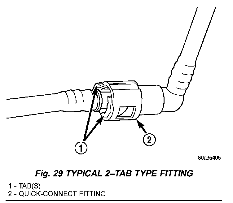 7. Two-Tab Type Fitting: This type of fitting is equipped with tabs located on both sides of fitting (Fig. 29). The tabs are supplied for disconnecting quick-connect fitting from component being serviced.