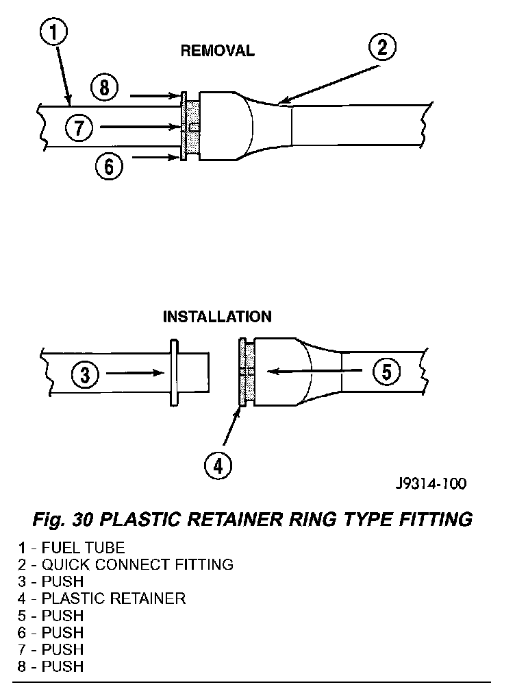 a. To release fuel system component from quick- connect fitting, firmly push fitting towards component being serviced while firmly pushing plastic retainer ring into fitting (Fig. 30). With plastic ring depressed, pull fitting from component. The plastic retainer ring must be pressed squarely into fitting body. If this retainer is cocked during removal, it may be difficult to disconnect fitting. Use an open-end wrench on shoulder of plastic retainer ring to aid in disconnection.