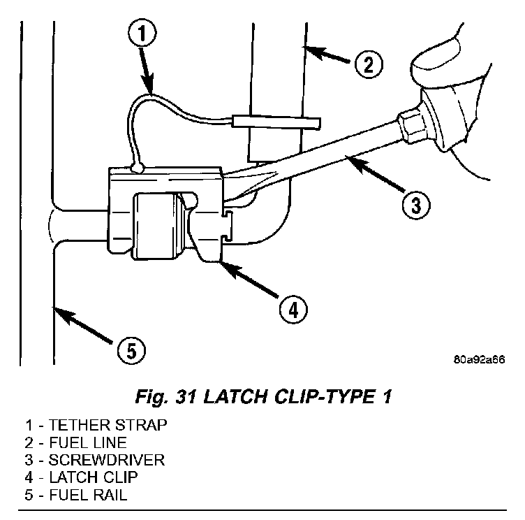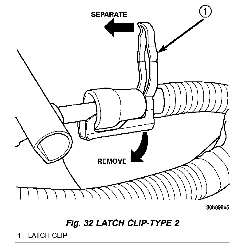 9. Latch Clips: Depending on vehicle model and engine, 2 different types of safety latch clips are used (Fig. 31) or (Fig. 32). Type-i is tethered to fuel line and type-2 is not. A special tool will be necessary to disconnect fuel line after latch clip is removed. The latch clip may be used on certain fuel line/fuel rail connection, or to join fuel lines together.