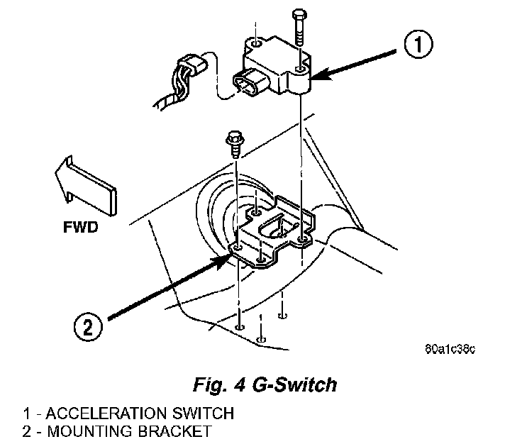 CAUTION: The mercury switch (inside the G-switch), will not function properly if the switch is installed incorrectly. Verify that the switch locating arrow is pointing to the front of the vehicle.