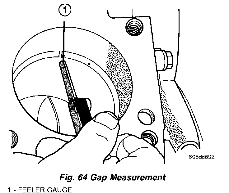 4. Place ring in the cylinder bore and push down with inverted piston to position near lower end of the ring travel. Measure ring gap with a feeler gauge fitting snugly between ring ends (Fig. 64).