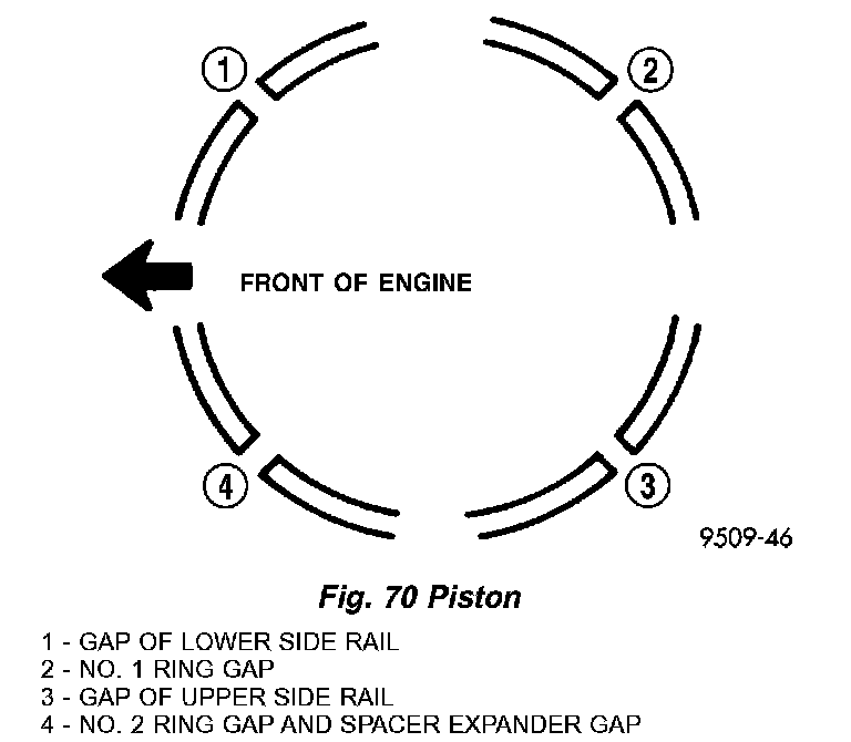 5. Position piston ring end gaps as shown in (Fig. 70).