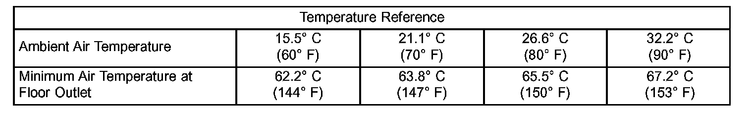 Using a test thermometer, check the temperature of the air being discharged at the heater-A/C housing floor outlets. Compare the test thermometer reading to the Temperature Reference chart.
