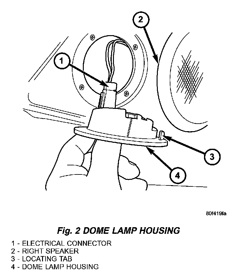 NOTE: The dome lamp housing is equipped with a locating tab that must be inserted in to the speaker housing for proper positioning.