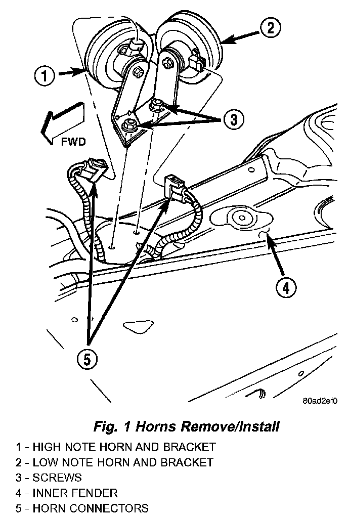 4. Remove the horn and mounting bracket units from the left front inner fender shield.