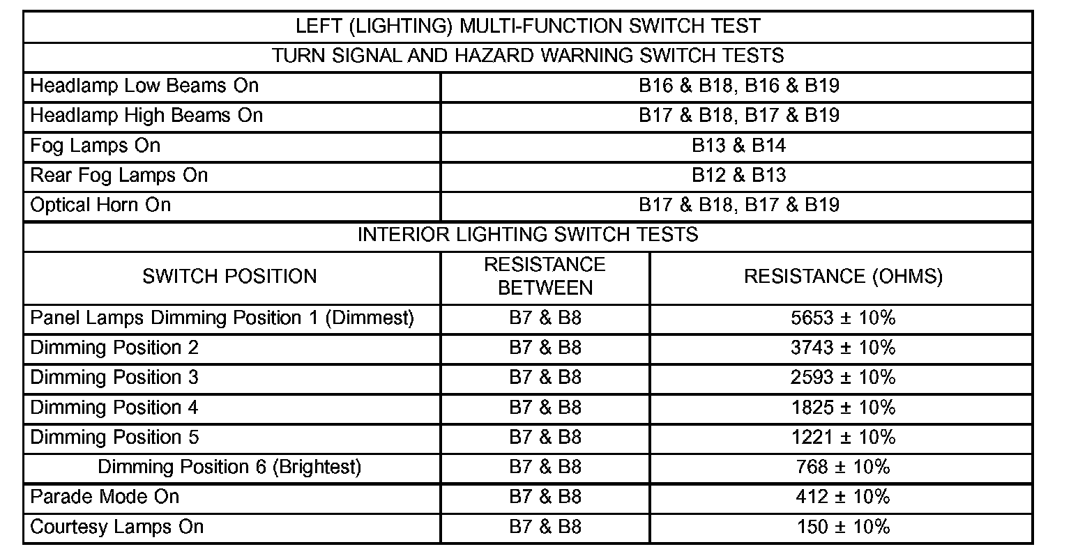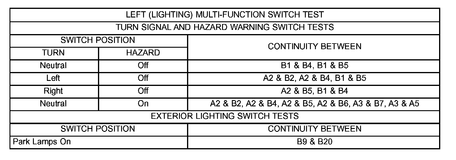 4. Using an ohmmeter, perform the continuity and resistance tests at the terminals in the left multi-function switch connector receptacles as shown in the Left Multi-Function Switch Test table. Refer for connector terminal and cavity identification.