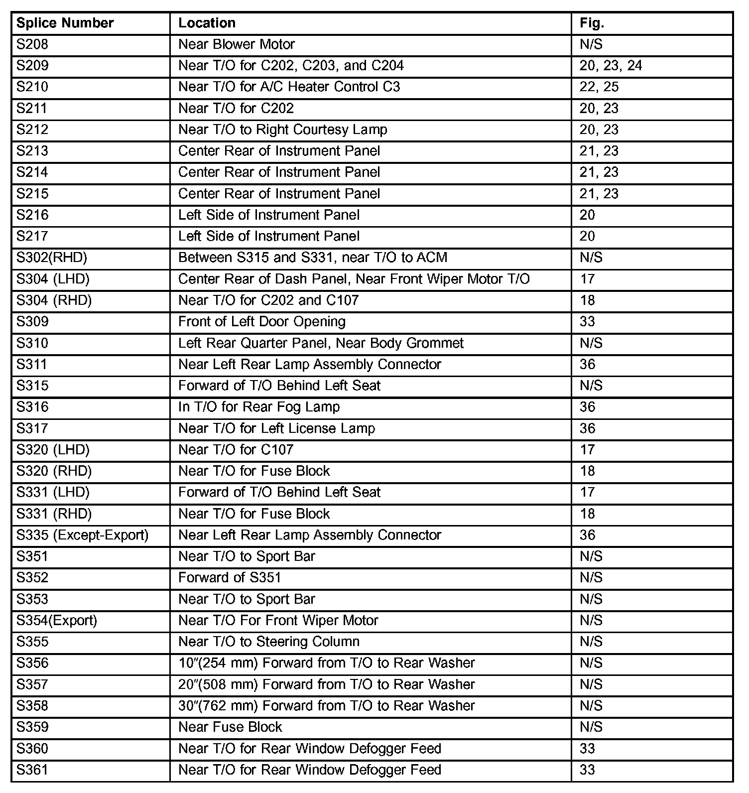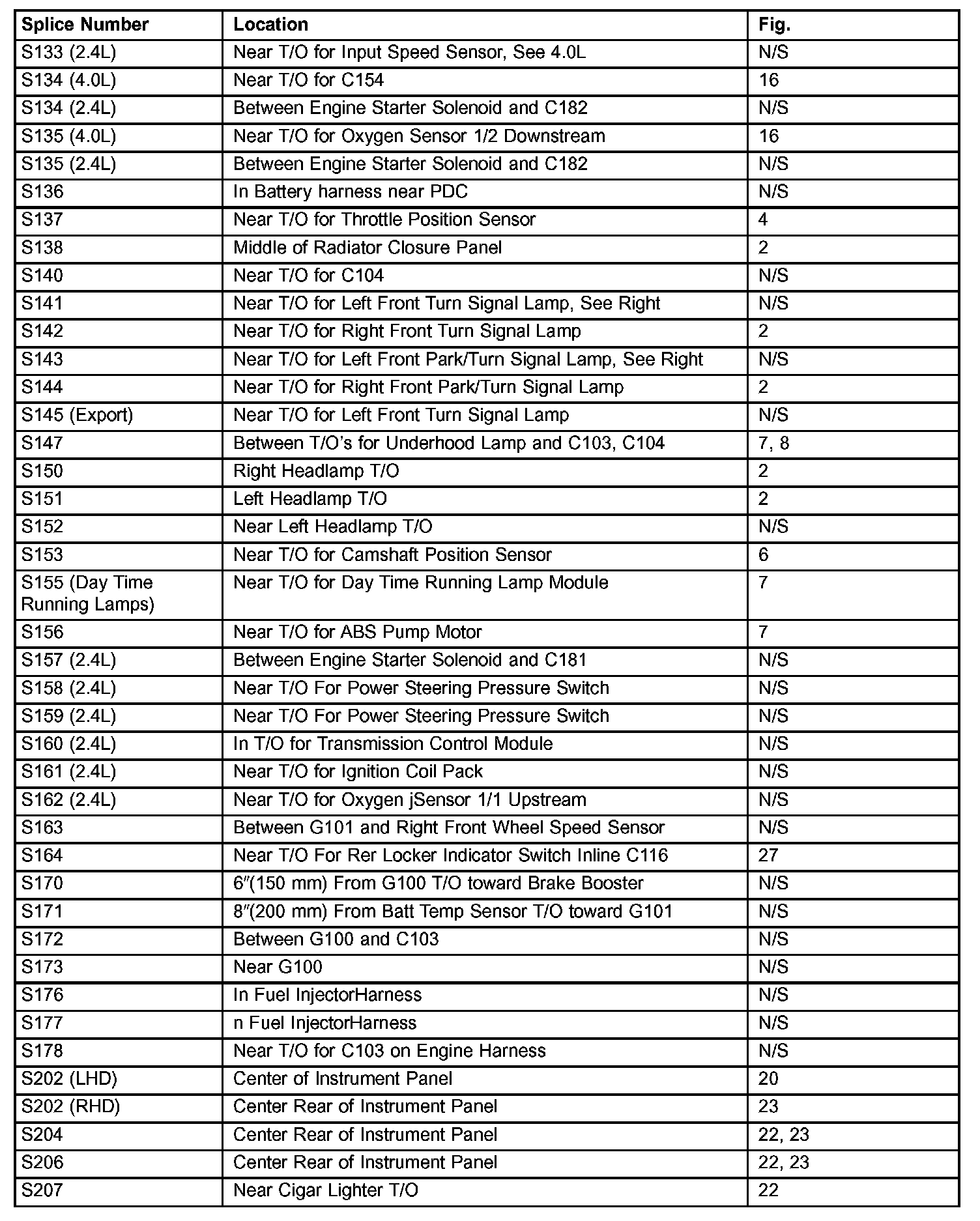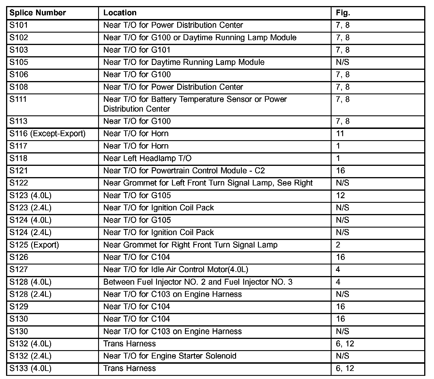 The abbreviation T/O (Take Out) is used in the location column to indicate a point in which the wiring harness branches out to a component.