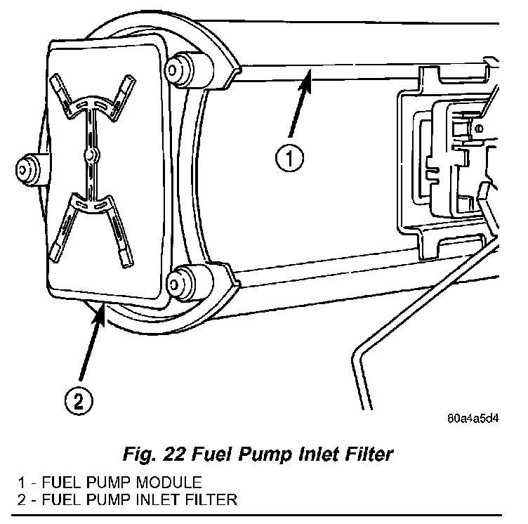 The fuel pump inlet filter (strainer) is located on the bottom of fuel pump module (Fig. 22). The fuel pump module is located on top of fuel tank.