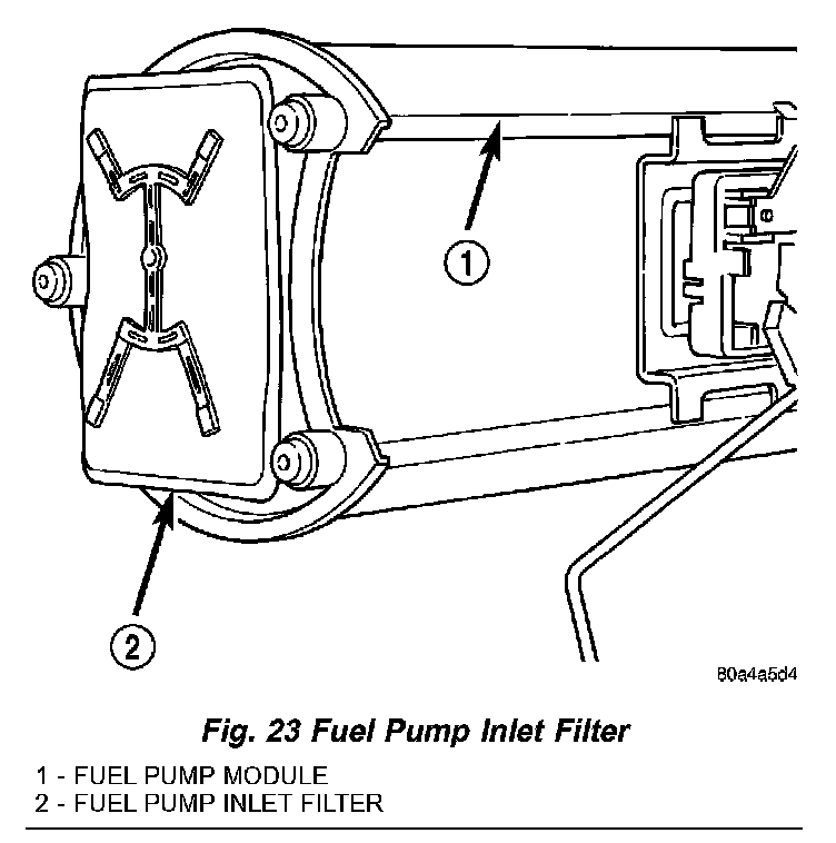 The fuel pump inlet filter (strainer) is located on the bottom of fuel pump module (Fig. 23). The fuel pump module is located on top of fuel tank.
