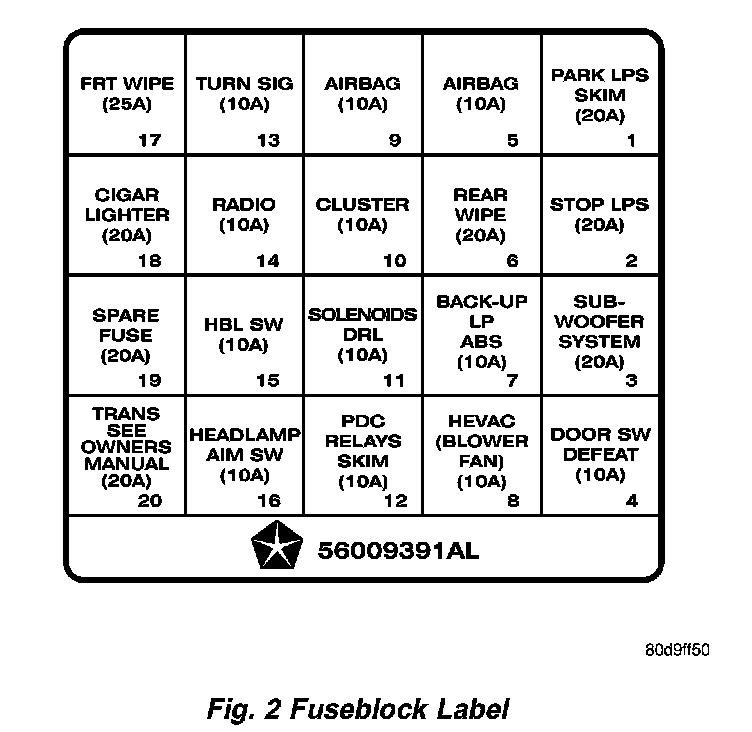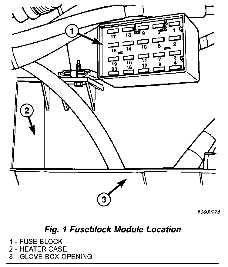 An electrical fuseblock module is mounted on the dash panel in the passenger compartment of the vehicle (Fig. 1). The fuseblock module serves to distribute electrical current to many of the accessory systems in the vehicle. The fuseblock module houses up to twenty blade-type mini fuses.