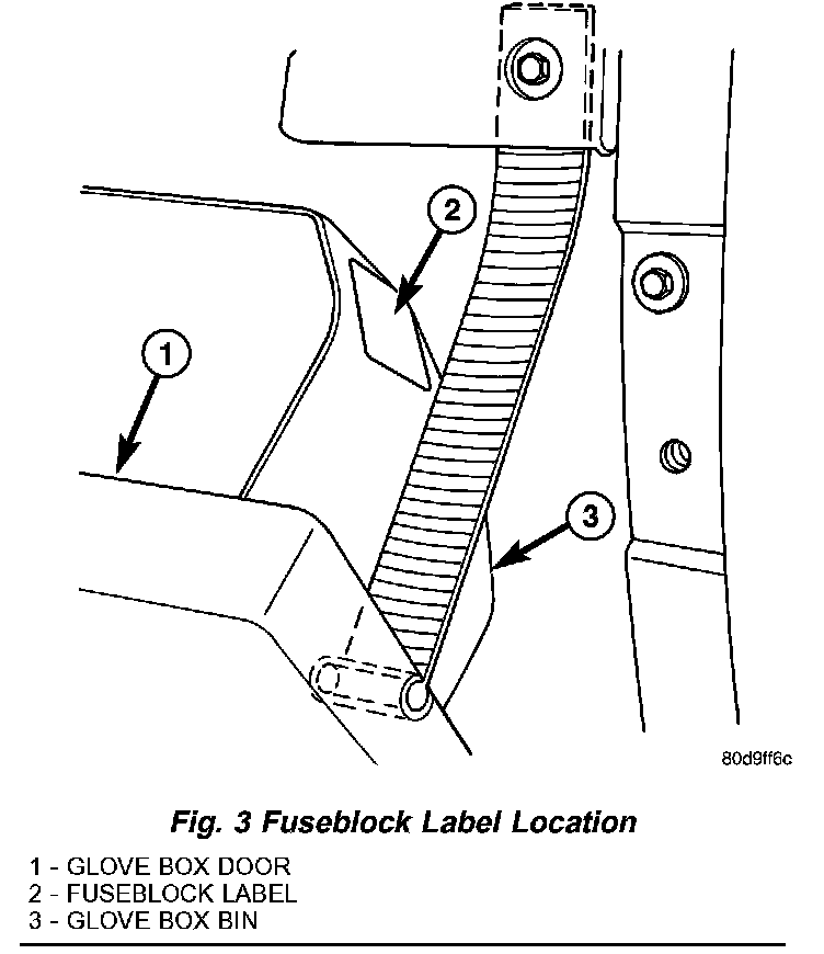 The molded plastic fuseblock module housing has an integral mounting bracket that is secured with two screws to a bracket welded on the dash panel just above the heater and air conditioner housing. The glove box is rolled down from the instrument panel for service access of the fuseblock module fuses. An adhesive-backed fuse layout map (Fig. 2) is located on the outside of the glove box bin (Fig. 3) to ensure proper fuse identification.