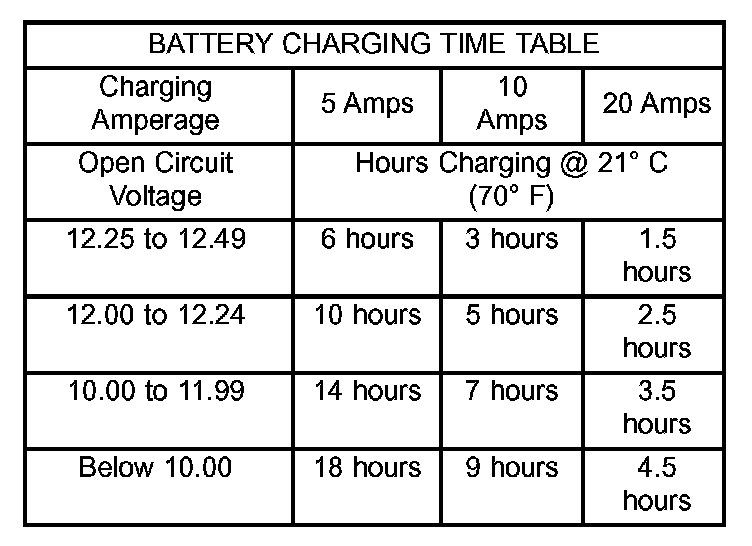 The Battery Charging Time Table gives an indication of the time required to charge a typical battery at room temperature based upon the battery state-of-charge and the charger capacity.