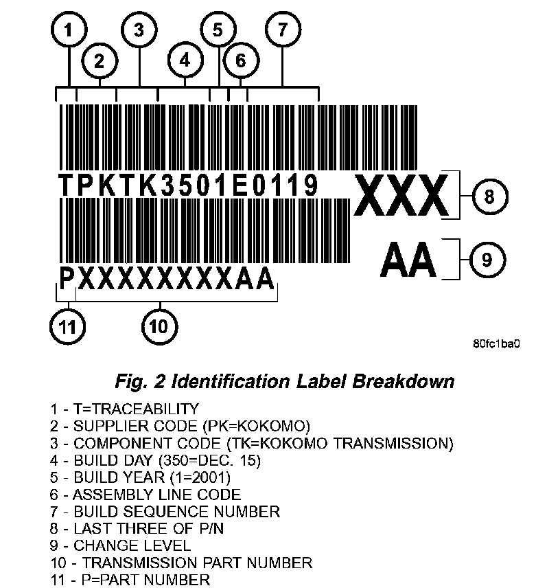 The label contains a series of digits that can be translated into useful information such as transmission part number, date of manufacture, manufacturing origin, assembly line identifier, build sequence number, etc. Refer to (Fig. 2) for identification label breakdown. If the tag is not legible or is missing, the "PK" number, which is stamped into the left rear flange of the transmission case, can be referred to for identification. The entire part number, build code, and sequence number are stamped into the flange.