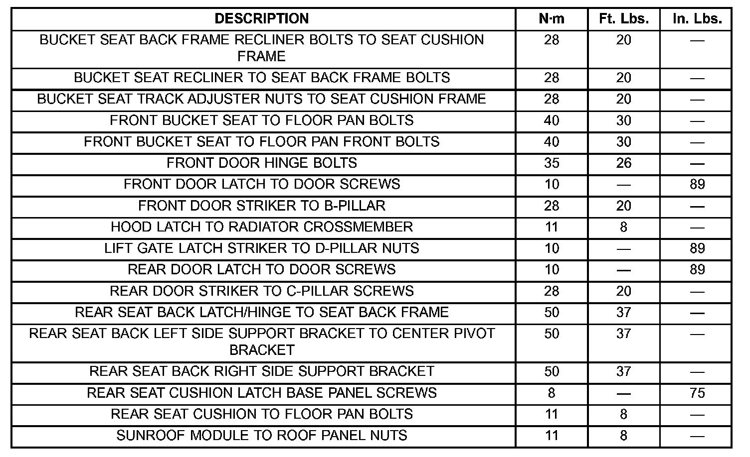 SPECIFICATIONS - TORQUE