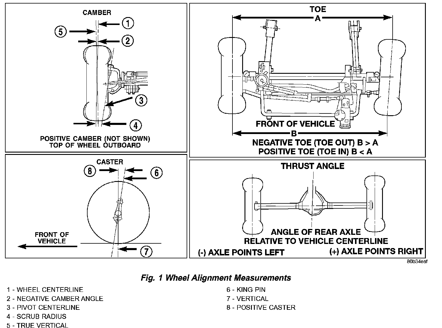 THRUST ANGLE is the angle of the rear axle relative to the centerline of the vehicle. Incorrect thrust angle can cause off-center steering and excessive tire wear. This angle is not adjustable, damaged component(s) must be replaced to correct the thrust angle.