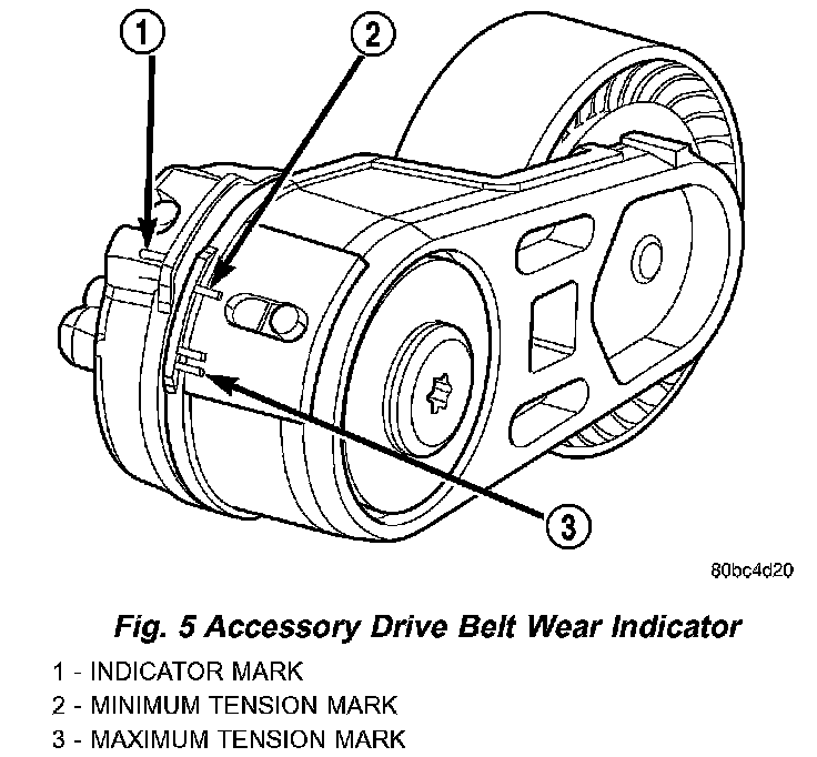 3. With the drive belt installed, inspect the belt wear indicator (Fig. 5). On 4.0L Engines, the indicator mark must be between the minimum and maximum marks. If the measurement exceeds this specification replace the serpentine accessory drive belt.