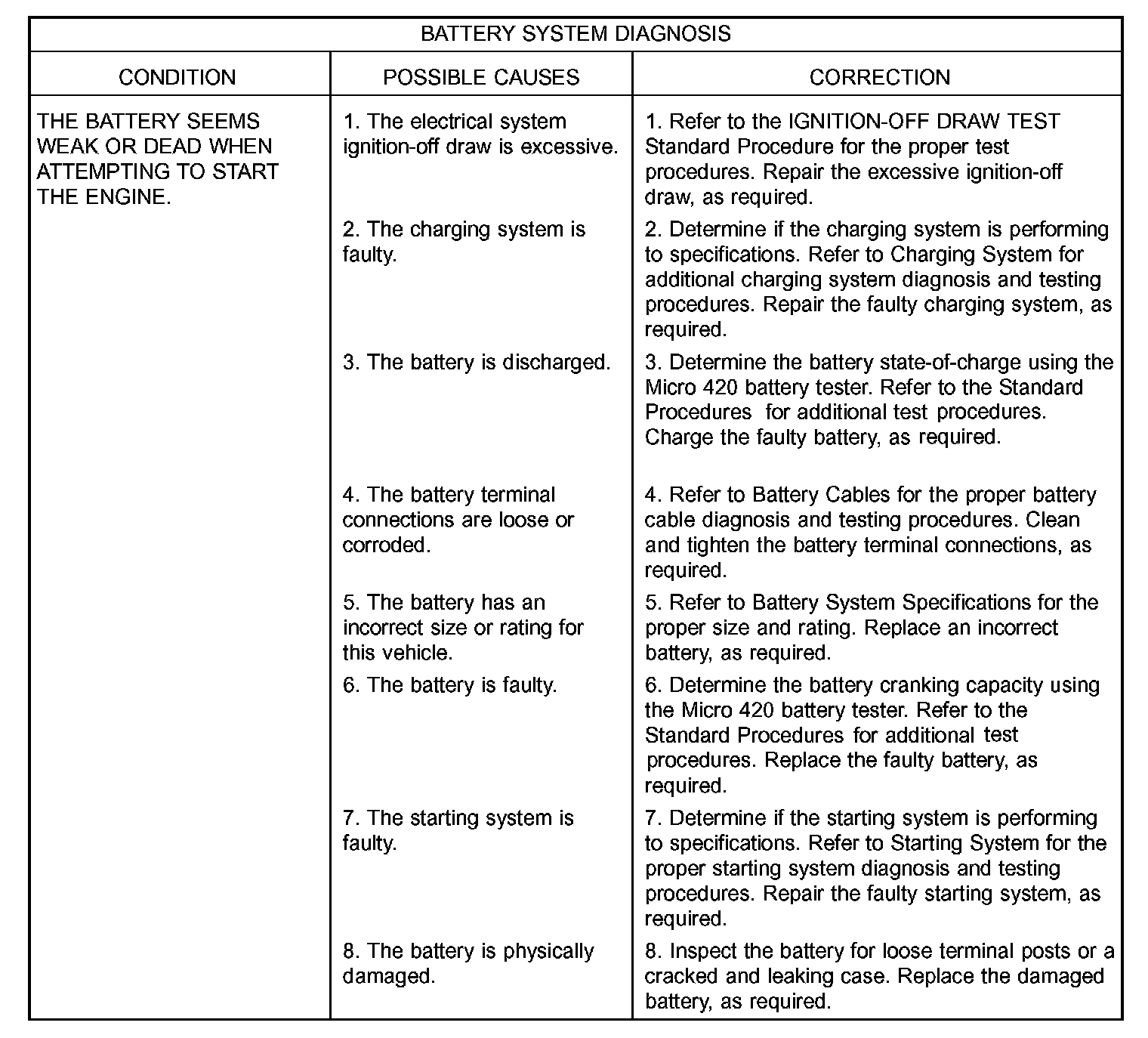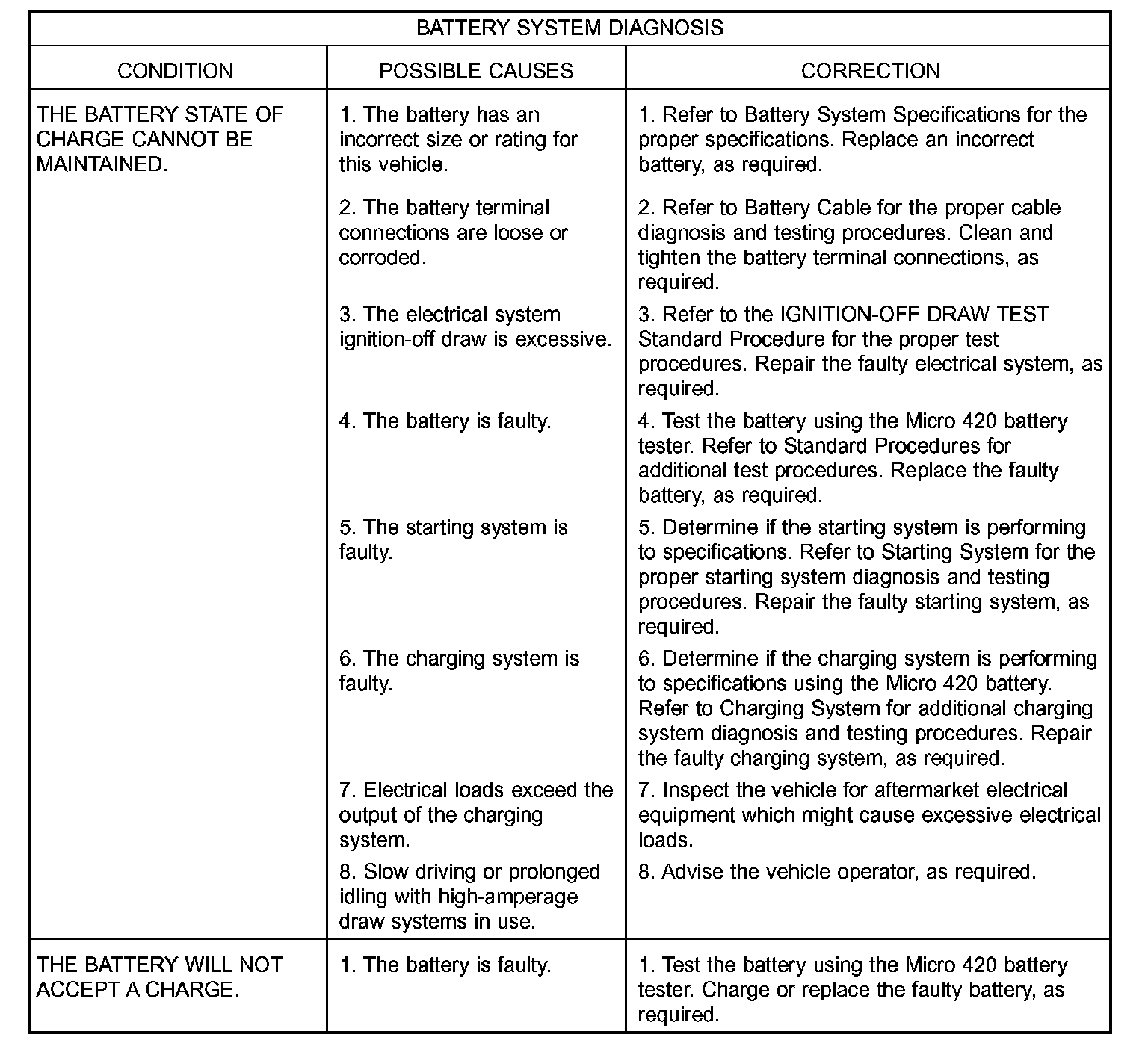 The Micro 420 automotive battery tester is designed to help the dealership technicians diagnose a defective battery. Follow the instruction manual supplied with the tester to properly diagnose a vehicle. If the instruction manual is not available refer to the standard procedure in this section, which includes the directions for using the Micro 420 electrical system tester.