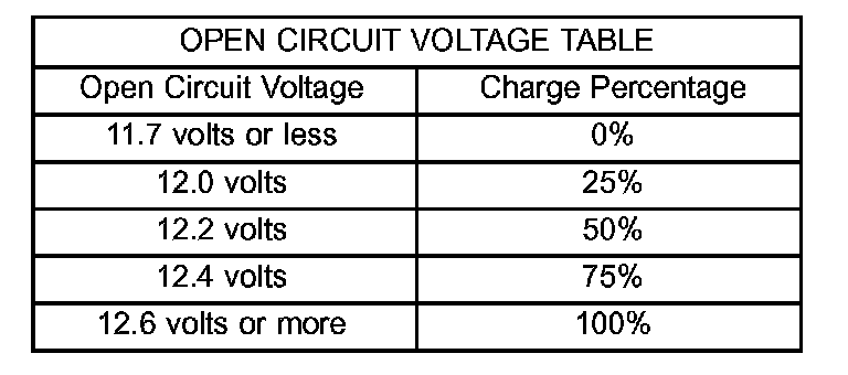See the Open-Circuit Voltage Table. This voltage reading will indicate the battery state-of-charge, but will not reveal its cranking capacity. If a battery has an open-circuit voltage reading of 12.4 volts or greater, it may be load tested to reveal its cranking capacity (Refer to ELECTRICAL/BATTERY SYSTEM/BATTERY - STANDARD PROCEDURE).