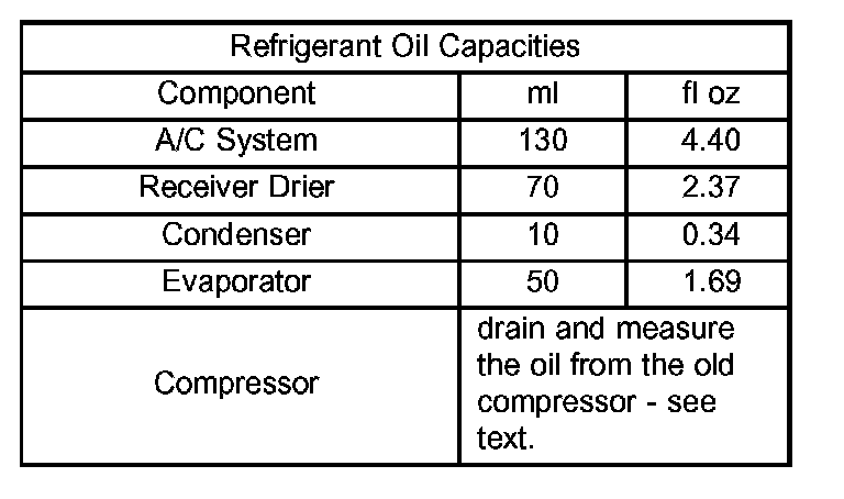 Refrigerant oil must be added when a accumulator, evaporator coil, or condenser are replaced. See the Refrigerant Oil Capacities chart. When a compressor is replaced, the refrigerant oil must be drained from the old compressor and measured. Drain all of the refrigerant oil from the new compressor, then fill the new compressor with the same amount of refrigerant oil that was drained out of the old compressor.