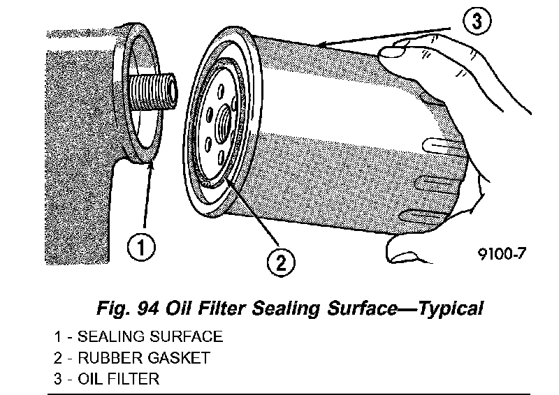 2. Thread filter onto adapter nipple. When gasket makes contact with sealing surface, (Fig. 94) hand tighten filter one full turn, do not over tighten.