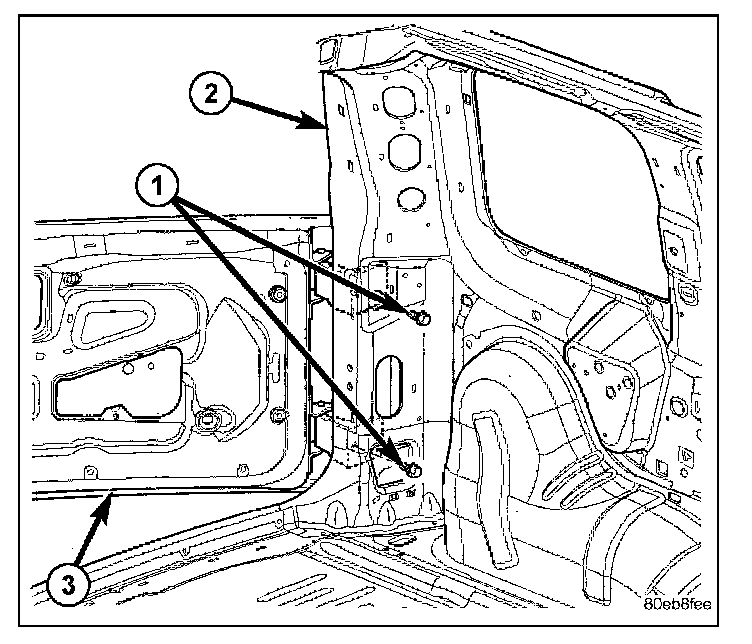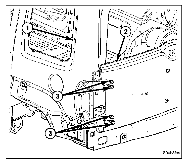 3. Remove the bolts (1) from inside the quarter panel.