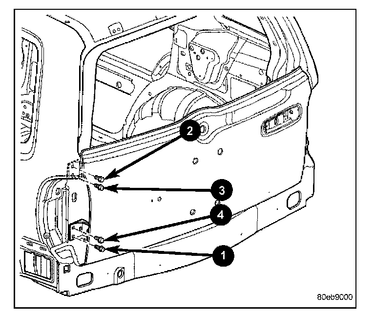 4. Remove the outer hinge bolts (3) and remove the hinges.