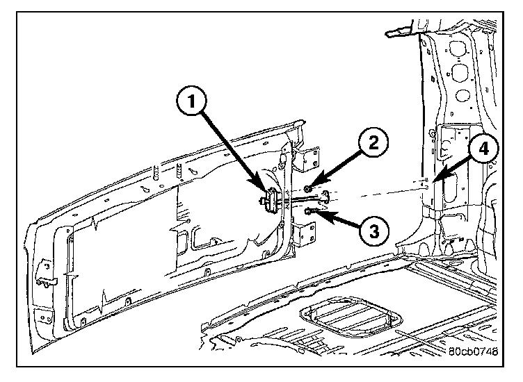 3. Remove the bolts (3) attaching the check strap (1) to the D-pillar (4).