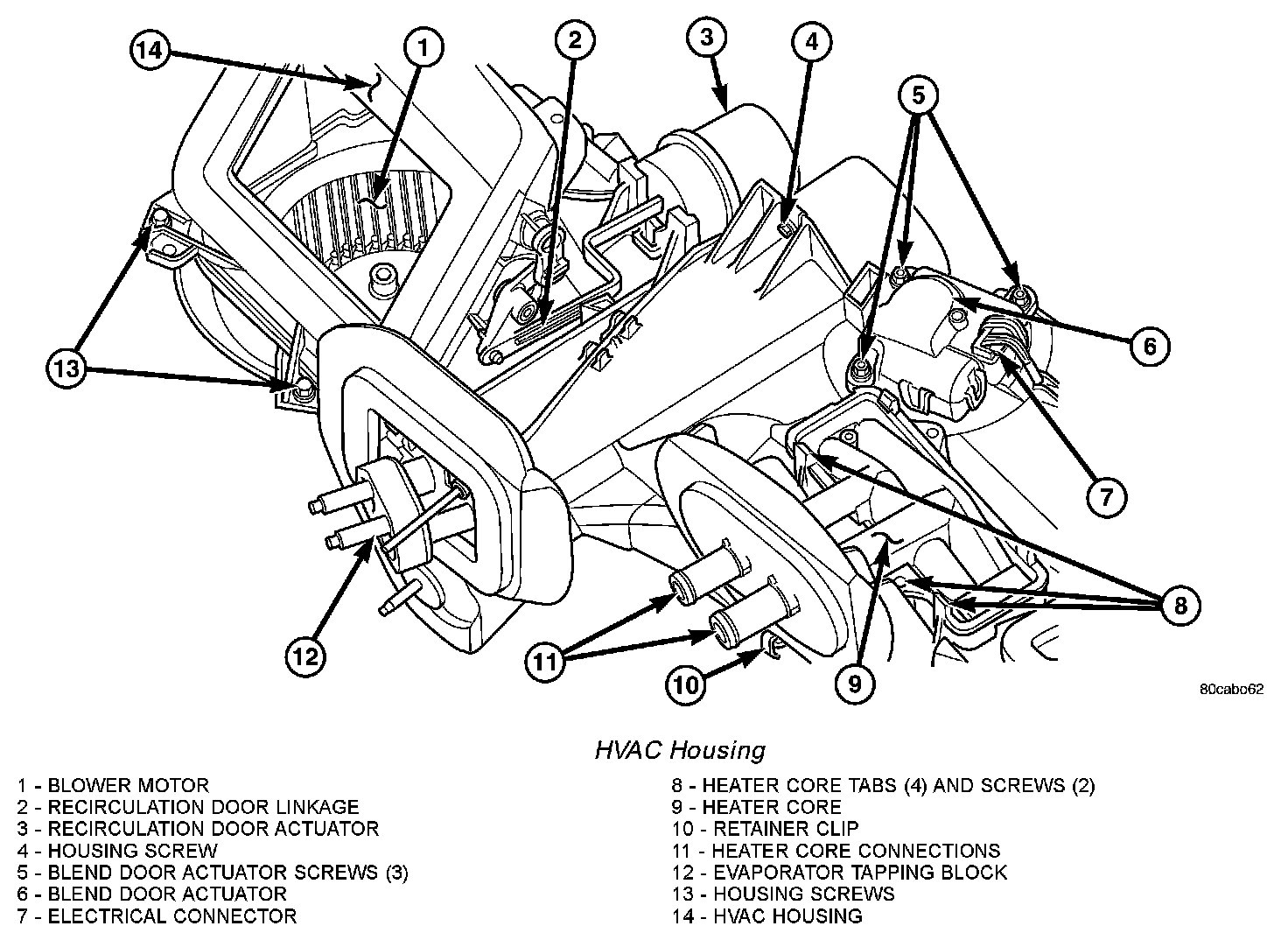 NOTE: The HVAC housing must be removed from the vehicle and the two halves of the housing separated for service of the heater core, A/C evaporator, blend door and each of the various mode doors.